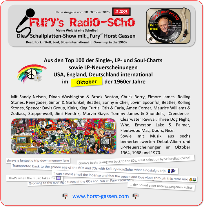 internationalen Top 100 Charts helfen mir bei der Programmgestaltung. Dies sind die Single-Charts und die LP-Charts in den USA, UK und BR Deutschland sowie die US R&B Soul Charts. Auch